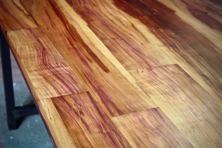 Pflaumenbaumholz ist für mich das schönste heimische Holz, das ich kenne. Es ist unglaublich lebendig und besticht durch die warmen Töne von Gelb, Orange, Braun mit violettfarbenen Einschlüssen. Dieses Holz bekommt man kaum zu sehen, da die Pflaumenbäume nicht grade wachsen und nicht sehr alt werden, wodurch es so selten einen Stamm gibt, der sich zum Aufschneiden eignet. Für diese wunderbare Platte haben wir einen ganzen Stamm gebraucht. Aus kleineren Stücken haben wir sie kunstvoll zusammengefügt. Ein absolut einmaliges Stück! Das Gestell aus rohen Stahlrohr hat unser Schmied im Dorf angefertigt. 200cm x 88cm, Höhe 77cm. Preis: 2300,- €