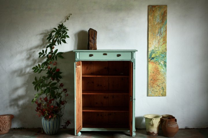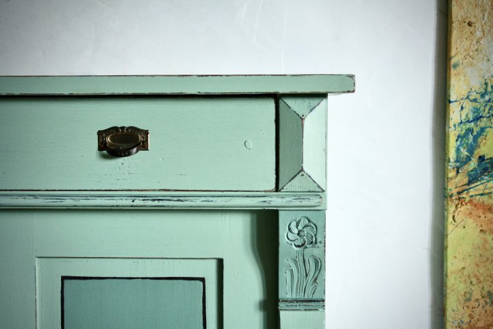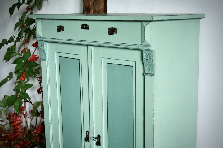 Vertiko aus Nadelholz angefertigt. Die Farbgebung haben wir mit zwei Tönen abgesetzt und die originalen schwarzen Linien erhalten. Breite 98cm, Höhe 137cm, Tiefe 43cm. Preis: 880,- €