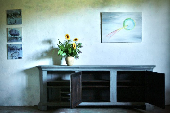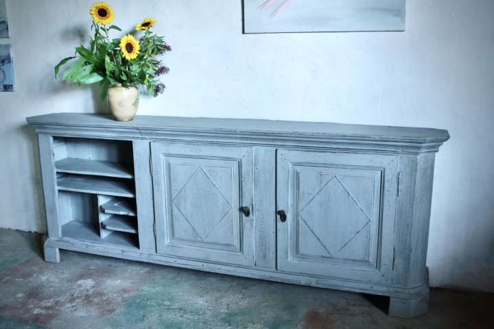 Ca. 1840 wurde dieses sehr besondere Möbel angefertigt. Es stammt wohl aus dem Weser Bergland und diente ursprünglich als "Milchschrank", flache Tonschalen zur gewinnung von Quark und Frischkäse fanden dort Platz. Ein sehr schönes und seltenes Möbel, wie ich es in den vielen Jahren meiner Beschäftigung mit alten Möbeln noch nie zu Gesicht bekommen habe. Breite 228cm, Höhe 86cm, Tiefe 37cm. Verkauft!