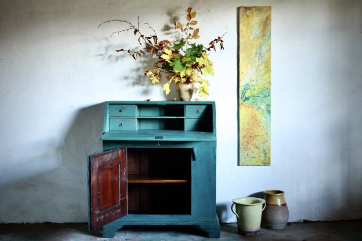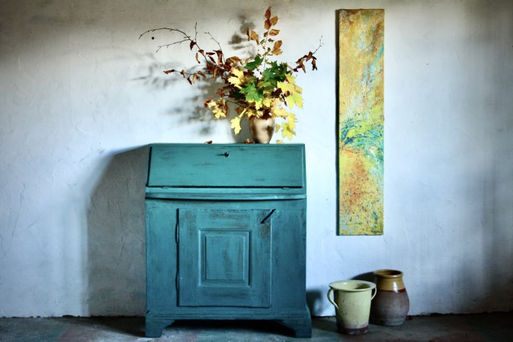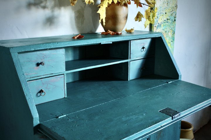 Ca. 1840 wurde dieses sehr besondere Möbel angefertigt. Man kann sich vorstellen, dass es mal z.B. bei dem Müller im Dorf stand und dort seine Notizen machte. Breite 100cm, Höhe 119cm, Tiefe 50cm. Preis: 1400,- €