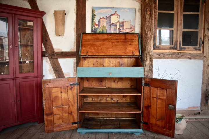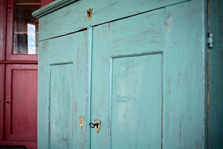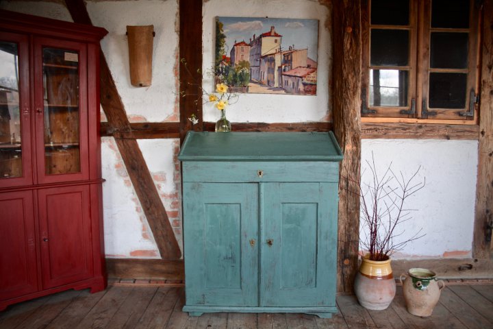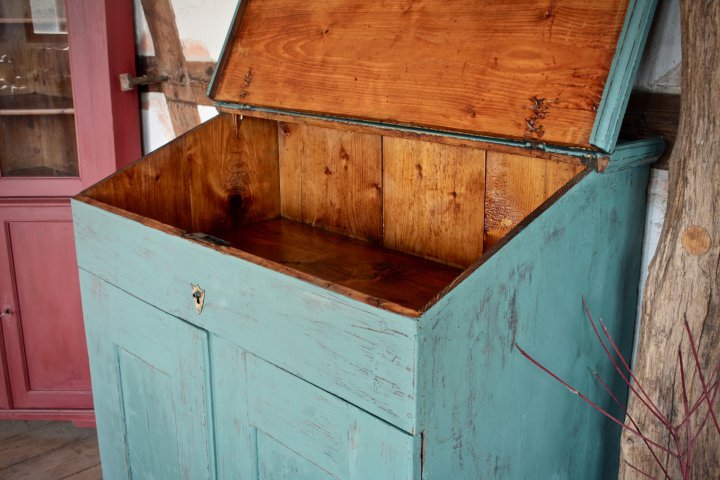 Ca 1840 wurde dieses seltene Möbel aus Kiefernholz angefertigt. Die frische türkis-grüne Farbgebung gibt ihm seinen besonderen Charakter. Die sehr schönen Schlüsselschilder aus Messing sind noch original erhalten. Breite 98cm, Höhe 117cm, Tiefe 55cm. Verkauft!