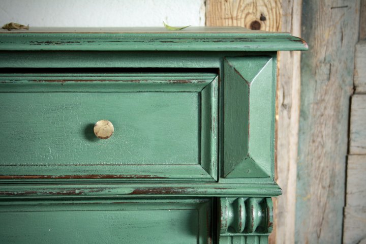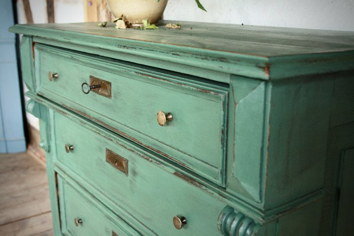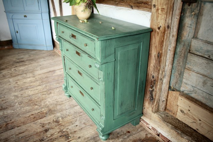 Ca. 1890 wurde diese Kommode in Norddeutschland angefertigt. Durch unsere tief-grüne Farbgebung hat sie ihren sehr besonderen Charakter bekommen. Breite 98cm, Höhe 102cm, Tiefe 50cm. Preis: 740,- €