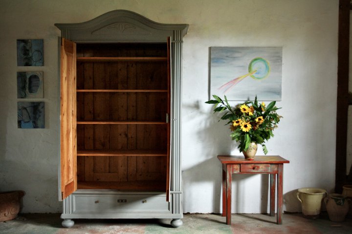 Um 1900 wurde dieser schöne Schrank aus Nadelholz angefertigt. Mit seinen vorhandenen Boarden und der großen Schublade bietet er viel Stauraum z.B. als Wäscheschrank. Gerne können wir Ihnen aber auch eine Kleiderstange einbauen. Breite 120cm, Höhe 220cm, Tiefe 56cm. Preis: 1580,- €