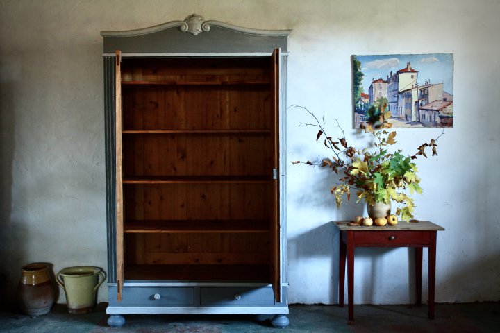 Um 1900 wurde dieser Dielenschrank aus Kiefernholz angefertigt. Unsere Grau - weiße Farbgebung verleiht ihm seinen leicht und edel wirkenden Charakter. Innen ist er mit vier Boarden ausgestattet. Wir können ihn aber auch mit einer Kleiderstange versehen. Breite 220cm, Höhe 209cm, Tiefe 58cm. Preis: 1480,- €