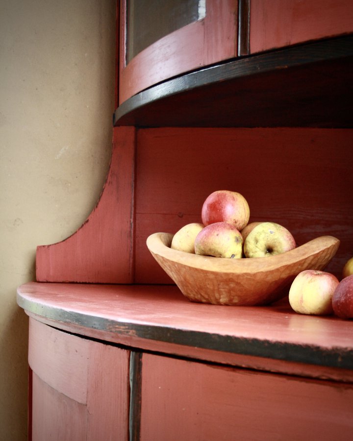 Diese sogenannte Vierteltonne wurde ca. 1840 in der Elbmarsch angefertigt. Ein sehr wohlproportionierter Eckschrank in seiner für die Biedermeierzeit typischen reduzierten Formsprache. Durch unsere rote Farbgebung mit den original geschwärzten Leisten und den eingelassenen Schlüsselschildern aus Ebenholz erhält er seinen einzigartigen Charakter. Höhe 200cm, Schenkeltiefe 80cm. Preis: 2600,- €