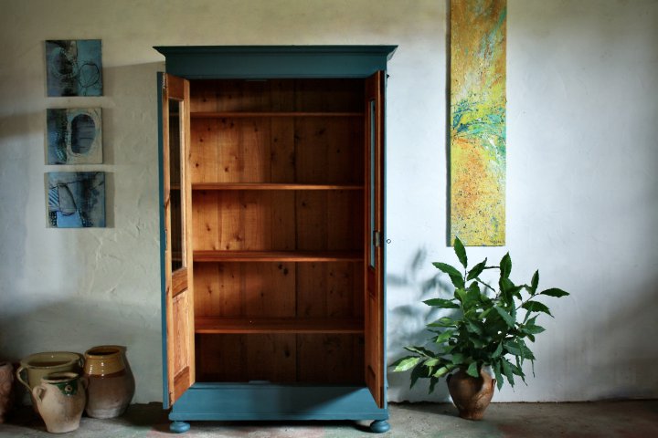 Ca 1890 wurde diese Vitrine aus Nadelholz angefertigt. Sie hat schöne Proportionen und durch ihre schöne Farbgebung bekommt sie ihren edlen Charakter. Breite 105cm, Höhe 187cm, Tiefe 47cm. Verkauft!