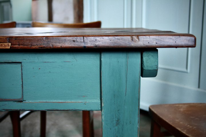 Ca. 1920 wurde dieser Tisch in der Lüneburger Heide angefertigt. Die starke Platte aus Buchenholz ist ca. 200 Jahre alt und wurde in den 20er Jahren auf dieses Gestell gearbeitet. Man sieht ihr an, dass hier schon viel Leben stattgefunden hat. Viele Gebrauchsspuren und der Brandfleck tragen zu seinen tollen, lebendigen Charakter bei. Dieser kräftige Tisch sucht einen großzügigen Platz, wo er sich entfalten kann. 190cm x 93cm, Höhe 78cm. Preis: 1800,- €