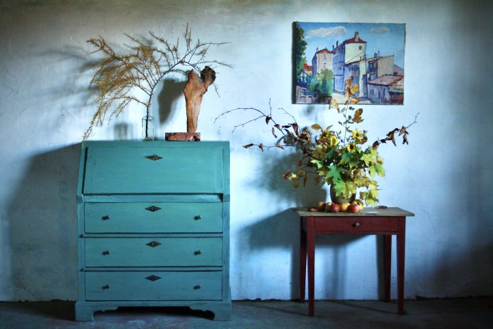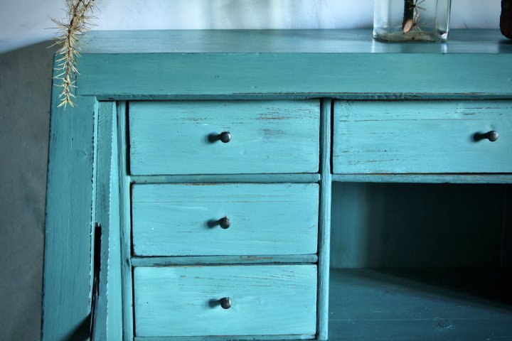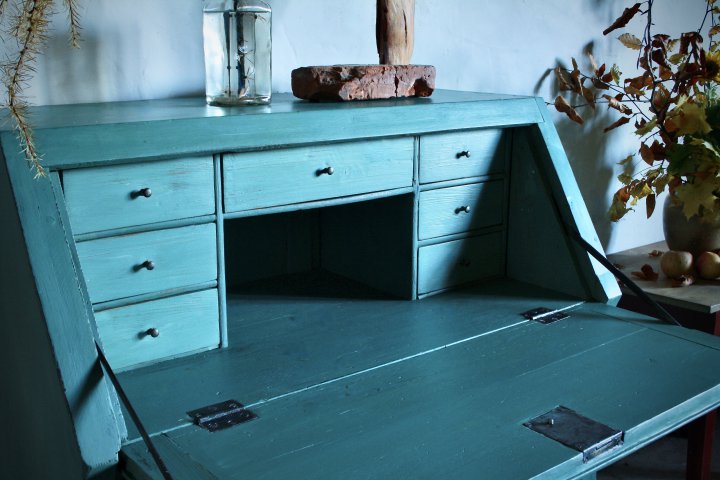 Ca. 1850 wurde dieser Sekretär aus Nadelholz angefertigt. Unsere Farbgebung verleiht ihm seinen frischen, lebendigen Charakter. Breite 92cm, Höhe 110cm, Tiefe 48cm/78cm. Preis: 1300,- €
