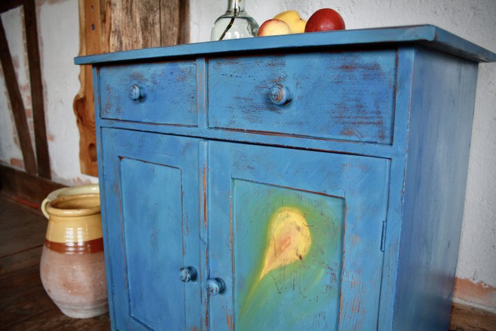 In den 20er Jahren wurde dieses Möbel angefertigt. Die Farbgestaltung macht sie zu einem einzigartigen Objekt. Breite 75cm, Höhe 75cm, Tiefe 42cm. Preis: 560,- €