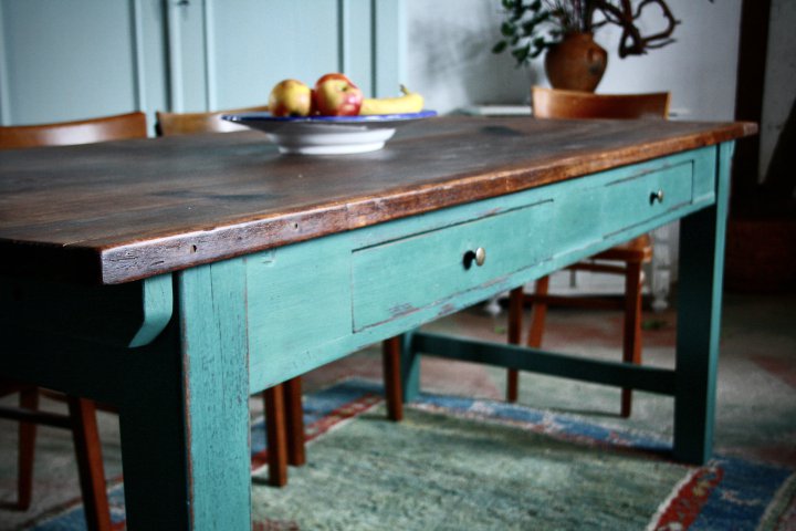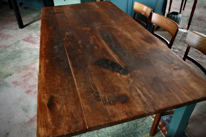 Ca. 1920 wurde dieser Tisch in der Lüneburger Heide angefertigt. Die starke Platte aus Buchenholz ist ca. 200 Jahre alt und wurde in den 20er Jahren auf dieses Gestell gearbeitet. Man sieht ihr an, dass hier schon viel Leben stattgefunden hat. Viele Gebrauchsspuren und der Brandfleck tragen zu seinen tollen, lebendigen Charakter bei. Dieser kräftige Tisch sucht einen großzügigen Platz, wo er sich entfalten kann. 190cm x 93cm, Höhe 78cm. Preis: 1800,- €