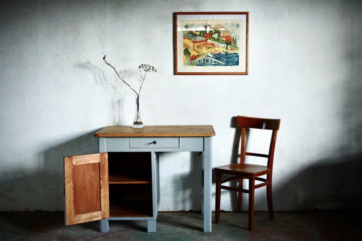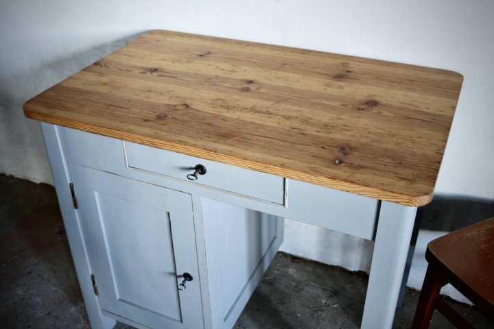 In den 20er Jahren entstand dieser kleine Tisch. Er diente in einem kleinen Landhandel als Kontorschreibtisch. Eine schöne Kombination aus Farbe und warmen Kiefernholz der Platte. Breite 92cm, Höhe 78cm, Tiefe 60cm. Preis: 680,- €