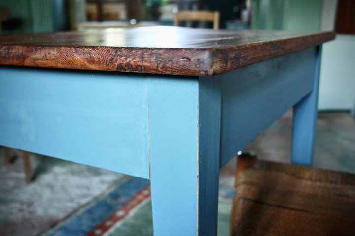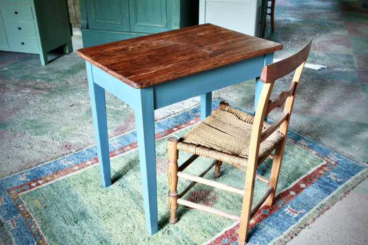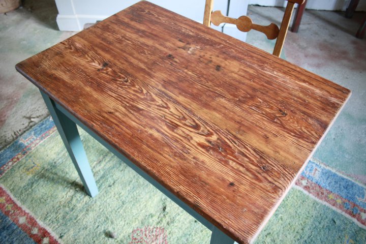 In den 20er Jahren wurde dieser Tisch in Eyendorf, Lüneburger Heide, angefertigt. Die Farbgebung bildet einen schönen Kontrast zu der warmen, lebendigen Platte aus Kiefernholz. 80cm x 54cm, Höhe 76cm. Preis: 420,- €