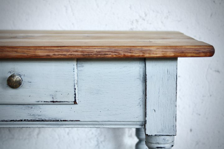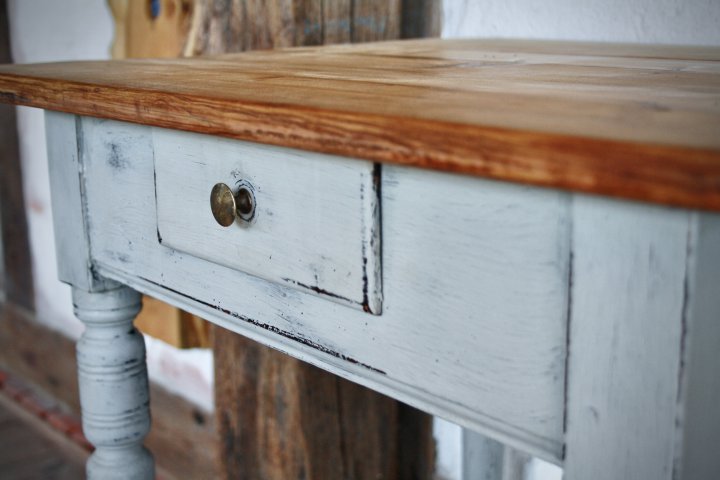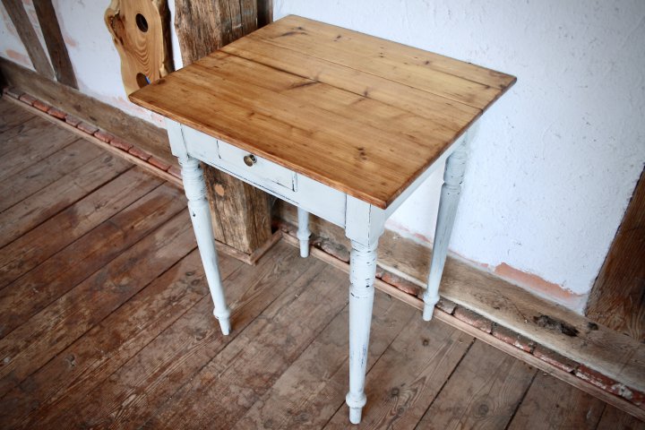 Dieses kleine Tischchen mit Schublade wurde um 1900 angefertigt. Das Gestell haben wir grau gefasst. Die Platte ist in schönem Nadelholz belassen. 60cm x 51cm, Höhe 76cm. Preis: 290,- €