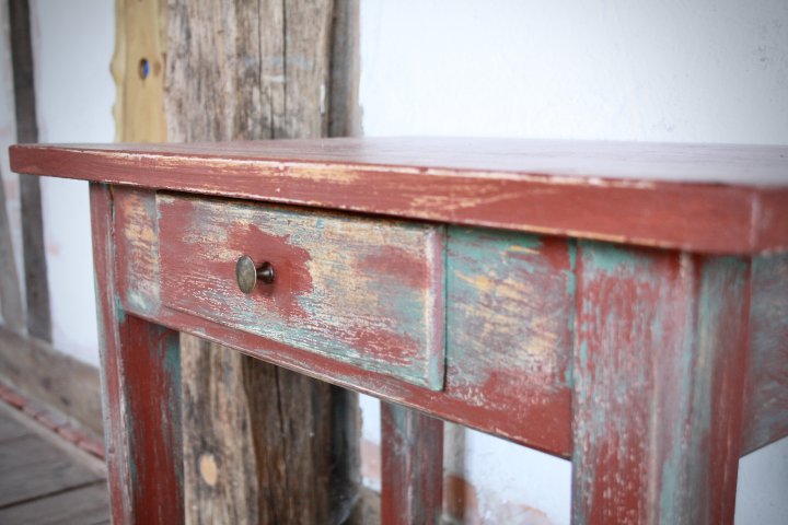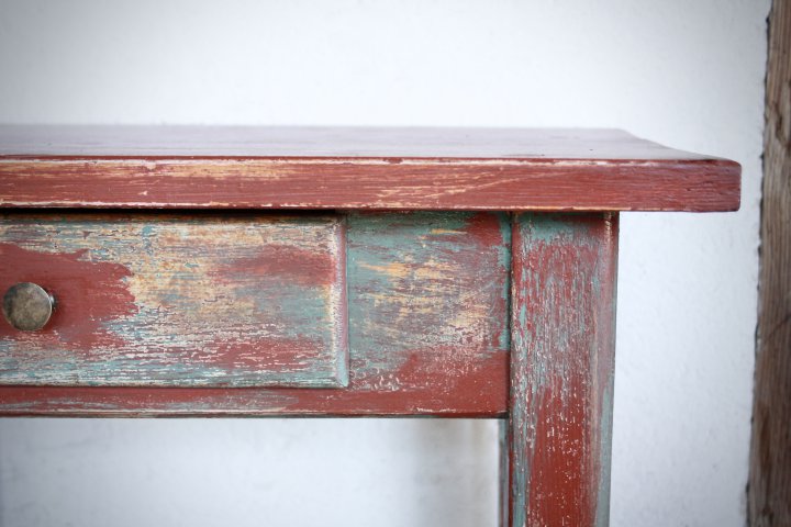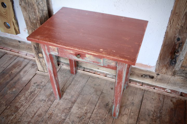 In den 20er oder 50er Jahren wurde dieses Beistelltischchen aus Fichtenholz angefertigt. Die spannende Farbgebung auf alter gelb-beiger Farbe verleiht ihm seinen besonderen Charakter. 70cm x 49cm, Höhe 68cm. Preis: 290,- €