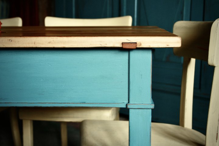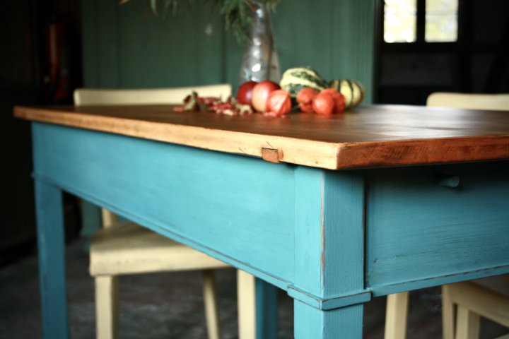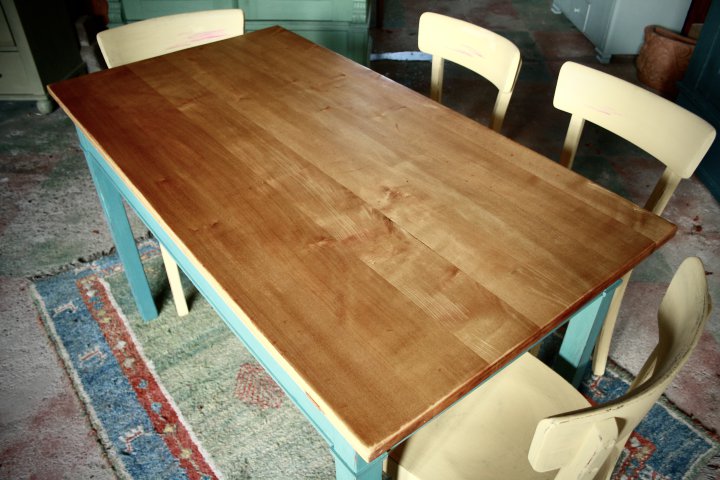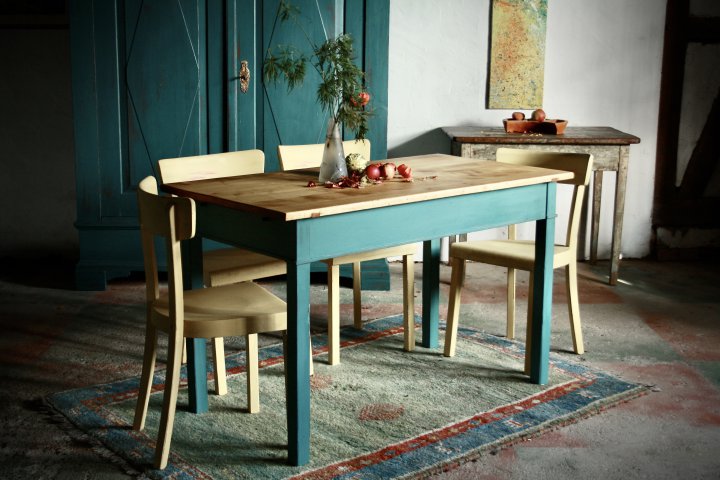 Dieser schöne Tisch wurde wahrscheinlich in der Biedermeierzeit ca. 1840 angefertigt. Die Platte aus Ahornholz und das farbige Gestell machen ihn zu einem sehr harmonischen Tisch. 130cm x 69cm, Höhe 80cm. Verkauft!