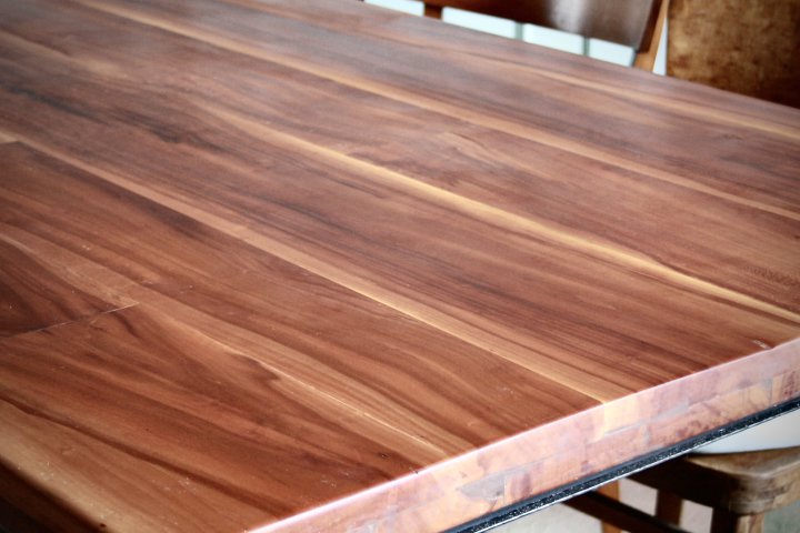 Pflaumenbaum ist eines unserer schönsten heimischen Hölzer. Der Baum wächst selten gerade und wird auch nicht sehr dick. Deshalb haben wir diese wunderschöne Platte aus kleinen Stücken zusammengesetzt. Das Metallgestell ist ein Unikat, dass wir für diesen Tisch angefertigt haben. 200cm x 86cm, Höhe 78cm. Preis: 1900,- €