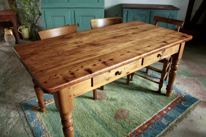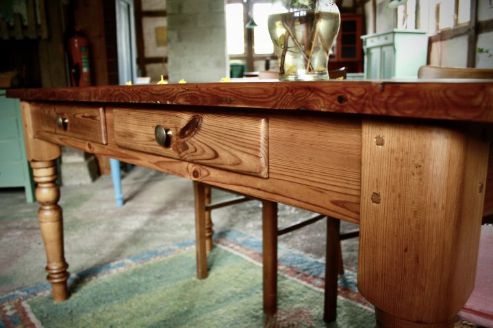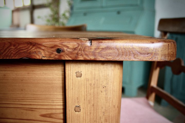 Ca. 1880 wurde dieser Tisch aus Kiefernholz angefertigt. Er hat eine tolle Ausstrahlung mit einer sehr schönen, lebendigen Platte. Ein ausdrucksstarker Tisch als Esstisch an dem man gut mit 6 Personen sitzen kann. Auch als Schreibtisch ist er sehr gut geeignet. 160 cm x 82 cm, Höhe 78cm. Preis: 1200,-€