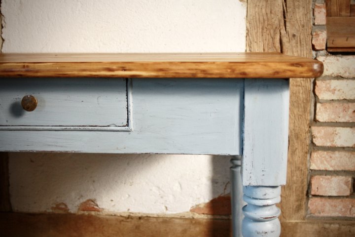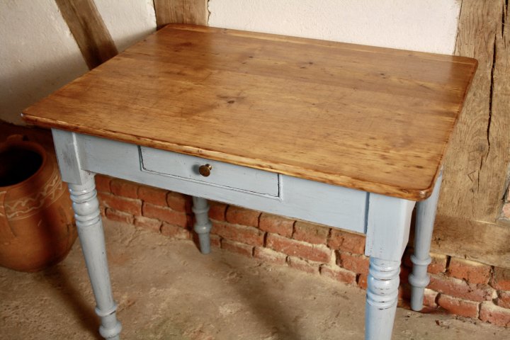Dieser hübsche Tisch wurde ca. 1880 in Magdeburg angefertigt. Sein grau/blau gefasstes Gestell bildet einen schönen Kontrast zur naturfarbenen Platte aus Nadelholz. 85cm x 80cm. Preis: 630,- €